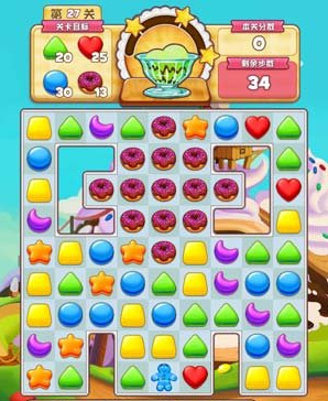 碎碎曲奇27关3星攻略,碎碎曲奇27关怎么过?本关的难点依然是空白分割造成的消除不便,而且有一些花色曲奇的消除要求,一般情况下来说这个需要慢点来,比如下面的蓝色可以消除竖条。