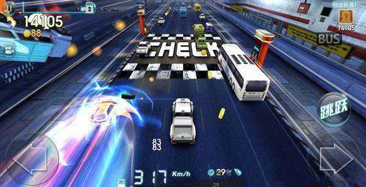 随着赛车不断的驰骋,空的能量槽将逐渐被黄色的能量填满,这就是你的氮气的储备量。而氮气储备的速度就和赛车的技能有关了。