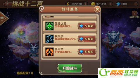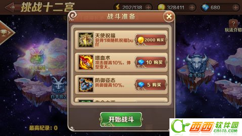 大家可以看到进入到挑战12宫的界面之后,就可以看到一开始的白羊宫了,这是我们今天的目标,通过白羊宫拿到丰厚的奖励。废话不多说,我们点开白羊宫挑战就会出现一个战斗前的准备,在这里我们可以挑选增幅自身属性的BUFF。天使的祝福可以随机获得一种BUFF,需要用200金币来购买。另外还有嗜血术增加攻击力,防御姿态,增加百分之10的防御能力。