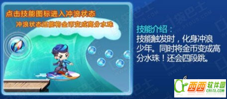 夏日冲浪:点击图标就能使用炫酷夏日风的冲浪技能,无敌且将金币变高分水泡.推荐超级模式金币密集处使用!