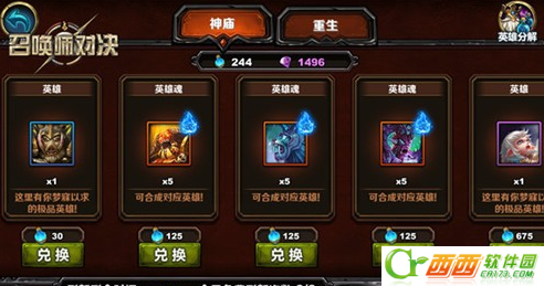 英雄兑换需要消耗指定英雄魂,英雄魂可利用灰烬兑换。灰烬的获得方法很简单,第一,灰烬采集器自动生成;第二,就是在神庙中分解3星以上英雄获得。随着游戏进行,玩家会获得很多用不上的3星英雄,这些都可以拿来分解。神庙分解的精妙之处就在于,它不仅能分解产出灰烬,还能产出强化英雄的粉尘,一举多得,还不赶紧来试试!