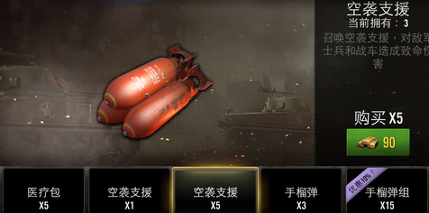 2、空袭支援×1:20金条,空袭支援×5:90金条。