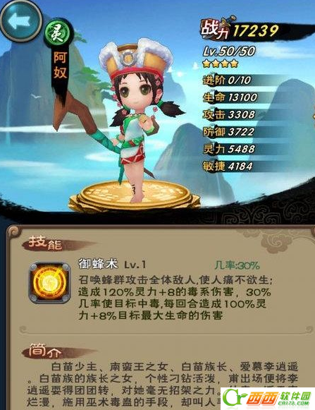 技能:御蜂术:召唤蜂群攻击全体敌人,使人痛不欲生造成120%灵力+8的毒系伤害,30%几率是目标中毒,每回合造成100%灵力+8%目标最大生命的伤害