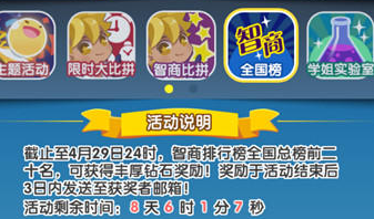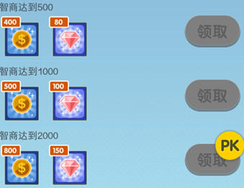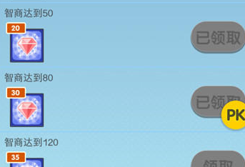 智商达到200、300、500、1000、2000、5000、8000、10000、15000、20000,对应奖励钻石分别是:20、60、80、100、150、200、300、400、500、600.