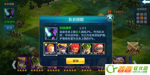 由于队长技能的效果不同,所以各位主公需要在战斗前进行灵活的更换,在战前的布阵界面,点击左上角的【更换】按钮,在弹出的界面中选择不同的英雄担任队长,即可更换队长技能了。