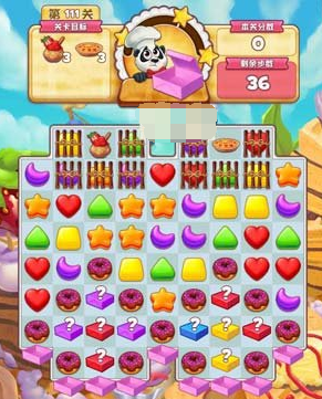 碎碎曲奇111关3星攻略,碎碎曲奇111关消除技巧,本关的难点在于下方的蛋糕盒子会随机变化,脸不好的朋友估计要哭,而且36步也不算特别宽裕,在不能合成特殊曲奇打穿一条路的情况下都不好走。