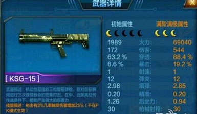 我们先来看看新出来的散弹枪KSG15,这枪和前面出的M16A2一样,都是有技能的,射击时有3%的几率触发伤害增加25%,这可以说是一个很不错的技能。