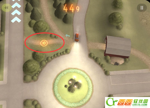 6、游戏中开车的时候会看见地上有圆圈中写着10和圆圈中写着20的图标,那个是分数,在不会撞车的情况下,最好还是吃一下。