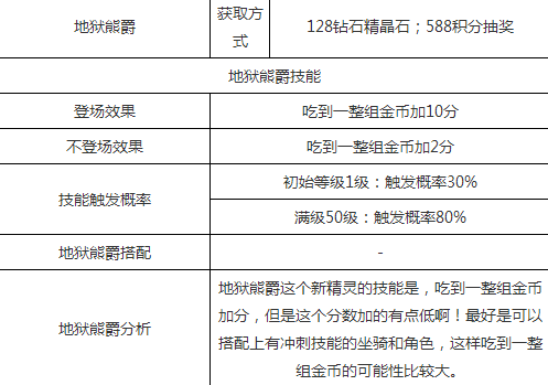 作为精灵家族的英熊联萌,里面的新精灵几乎是一个接一个的层出不穷,而天天酷跑在最近又将上线一个新的精灵——地狱熊爵,地狱熊爵也是英熊联萌里面的一员,它的加成跟吃到的金币多少有关系,那么地狱熊爵的具体属性是什么,地狱熊爵有着什么样的技能,关于这个新上线的精灵应该怎么获得,我们一起来看看吧。