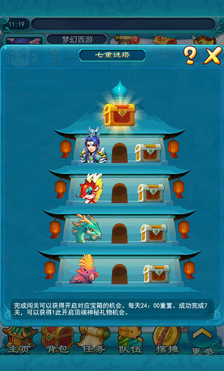 江南一隅忽现宝塔,此塔七层,塔顶光芒万丈,璀璨夺目。坊间盛传塔中有宝物,唯有兼具智慧、武艺、谋略之人方可到达。宝塔每层都驻守着一位奇人,需要通过考验方可进入天启福地探宝。每次通关可以获得开启对应宝箱的机会,每天24:00重置闯关次数(开启宝箱次数不重置)。
