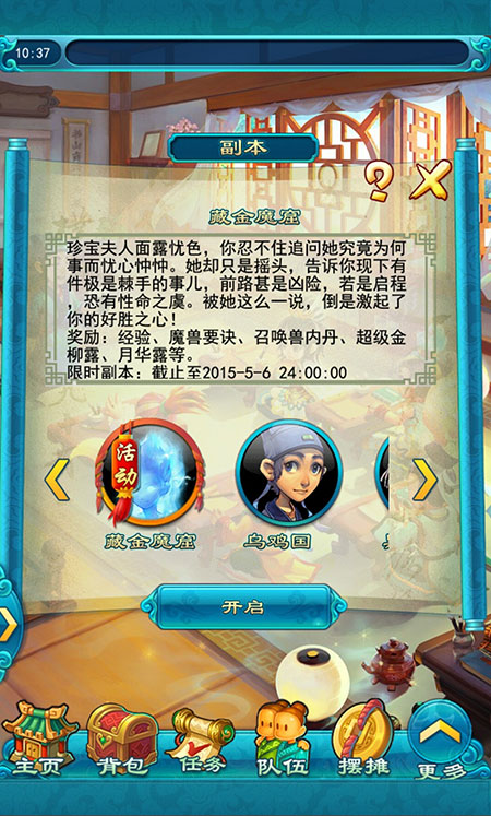 活动期间开启限时副本闯关,开启副本葫芦必定获得大量经验,并有机会获得魔兽要诀、召唤兽内丹、超级金柳露、如意丹、月华露、宝石等物品奖励。