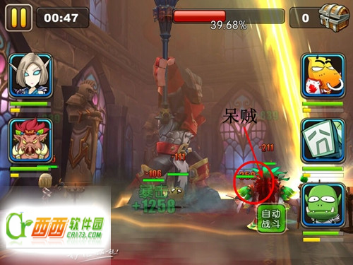终于狗男死了,这个时候中奶也发挥技能把狗男复活,代表得重新战斗一次了,右上方血量100%。也没关系,我方技能能量几乎全满,等待发挥时机,呆贼还没发动暗影步伐,有点慢慢的,如果发挥成功,代表难度降低60%,难度在于中奶。