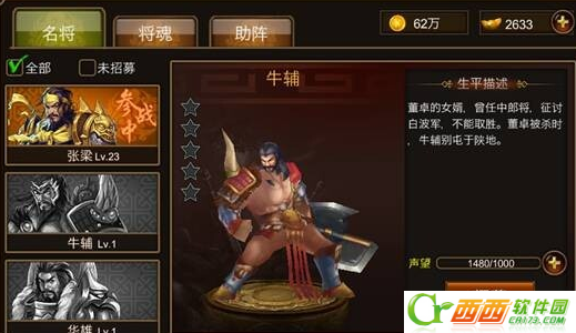 达到该条件后,点击【武将】图标,开始招募武将。点击【招募】按钮,便可将武将牛辅招募麾下。