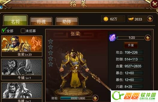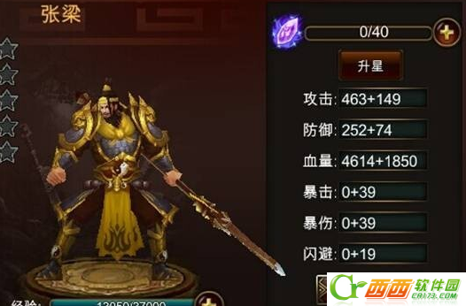 【武将进化】通过系统获得多余的武将之魂可以进化武将,下面还是以张梁为例子,收集张梁之魂40后,点击【升星】便可完成一次角色星级别的进化,成长值按比例增加武将属性。