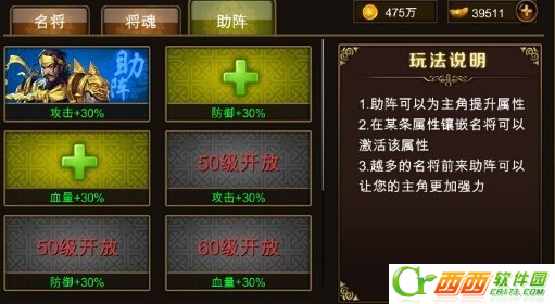 通过注入将魂,可提升招募武将的基础属性,注入越多,角色越强。第一次注入40将魂,便可将武将的基础数值属性提升一阶。
