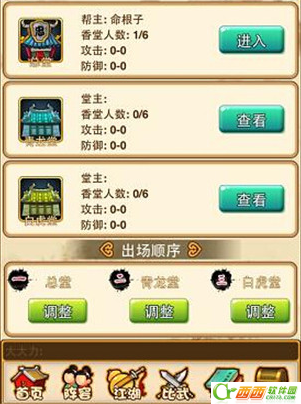 想要作战首先就要有人去参与,所以先要进入到香堂中进行任免。《比武招亲》中各帮派均有3个香堂,分别为总堂、青龙堂、白虎堂。