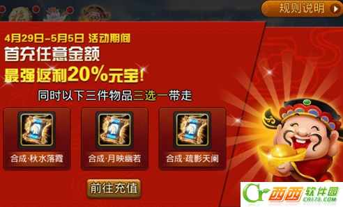 活动内容:新老玩家在活动期间首次充值任意金额,都将获得额外20%的元宝返利。充得多送得多,机会只有一次,不要错过咯!