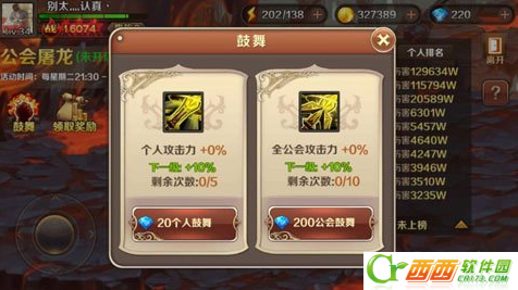 相信大家都去体验过了吧,公会屠龙这是一个非常有趣的玩法,各位玩家在开始的前五分钟准备,对个人以及公会进行鼓舞。鼓舞分为两种一种是对个人进行鼓舞,还有一种是全公会鼓舞,效果一样。手续爱你是个人鼓舞,可以为人物增加百分之10的攻击力,有着5次的机会,而公会鼓舞的话,是对全公会攻击力增加,可以增加10次哦。
