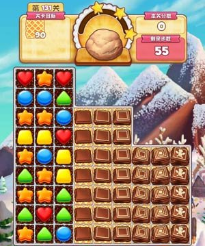 碎碎曲奇131关3星攻略,碎碎曲奇131关怎么过?本关右边有一大圈巧克力,而且我们的目标是威化饼,也就是说想完成任务必须做到全巧克力消除,我们可以从下面的绿色开始慢慢挖。