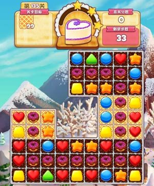 碎碎曲奇135关3星攻略,碎碎曲奇135关多重消除技巧,第135关没有太多的难点,唯一难点就是消除的要求高,而且多了一圈意味不明的甜甜圈,另外步数略少,方便的话最好控制在3步左右出特殊曲奇开启轰炸模式,否则步子容易不够。
