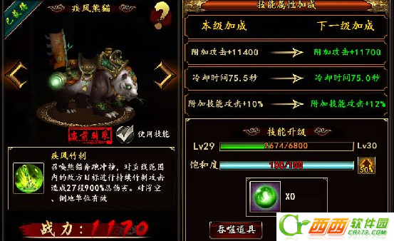 1. 疾风竹刺,召唤一个熊猫来回奔跑冲撞,对直线上的敌人造成持续性的竹刺伤害,伤害公式为27段900%总伤害,对浮空和倒地的敌人也能伤害到。