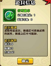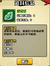 这是进阶所需要的道具之一,佩戴后可以显著增加武将的属性,佩戴后不能脱卸。青鸾石可以增加人物卡牌8点的攻击力,增加2点的防御力,同时增加40点以上的生命力。