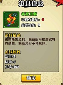 是进阶所需要的道具之一,佩戴后可以显著增加武将的属性,佩戴后不能脱卸。赤炎玉佩可以增加人物卡牌8点的攻击力,增加2点的防御力,同时增加100点以上的生命力。