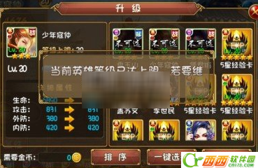 玩家在选定需要养成的英雄之后,点击【升级】,如果该英雄的等级没有达到上限,点击升级后,英雄的级别会提高;如果该英雄的等级已经达到上限,刚无法继续升级,必须先升阶才能进行英雄升级。