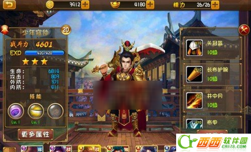 点击【装备】,可以看到页面这位英雄的装备,点击一键强化,就可将目前的所有装备提高一级。小编的少年寇仲装备等级还比较低,需要继续努力~