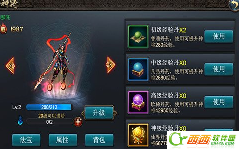 选中升级按钮,使用经验丹就可以给神将升级了。
