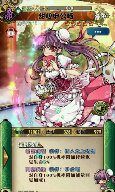最近幻想战姬的福袋都是两只两只的出,之前还有过三只出的情况,不过现在基本都是两个角色了。说到5月8日的福袋,其中一张是甜心申公喵。这个跟情人节应景的角色来到了福袋当中,没有的小伙伴可以抽抽抽了。话说小编的第一张相卡就是申公喵来着,这次的甜心申公喵还跟申公喵有着连携的技能,毕竟是帝卡,属性怎么样,我们一起来详细的了解一下吧。