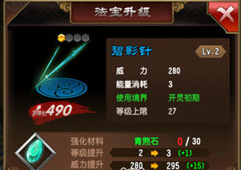 强化升级,需要青煞石、蓝曜石、紫阳石等来完成,所需材料根据碧影针品阶来对应。