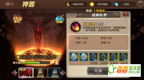 为神器添加升级材料,能够增加神器附加属性,当神器携带满所有材料就能够进行升级操作,神器升级后会提升神器技能的倍率和属性加成。