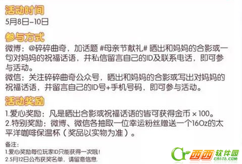 因为是游戏开启的活动,所以大家除了能够获得线上的游戏道具奖励以外,还能获得线上的实物奖励哦。参加活动不仅能够表达自己的对母亲的感情,更能获得大奖,心动不如行动。