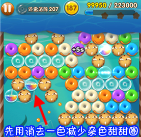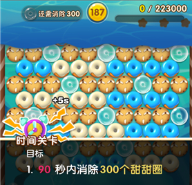 对于时间关卡,难点永远是如何在有限的时间内击落足够的甜甜圈并且拿到三星的奖励,本关需要消去的甜甜圈数量不多,只要达到300个即可,不过想获得三星就要比较高的能力值和足够快的速度了。