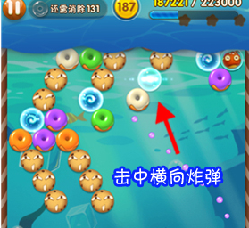 5.小鱼炸弹这时候可以发挥作用了,先击中小鱼炸弹,然后利用炸弹的爆炸的威力引爆上方的横向炸弹。这样一个子弹就可以清除整片的泡泡。