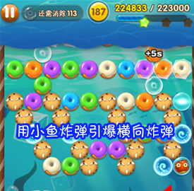 4.这部分我们同样是先清理掉横向炸弹下方的甜甜圈,然后击中炸弹后将其他甜甜圈和障碍物清理掉。右上的小鱼炸弹不要去击中,留在后面使用。