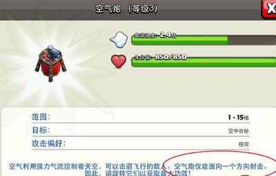 小编解答:在说明中,空气炮的范围显示为1-15格,很多玩家误以为是实际攻击范围,但是通过实践后发现,实际上1-15格式空气炮的触发范围,也就是说空气炮面对进攻的空军,首先需要触发,然后是瞄准。