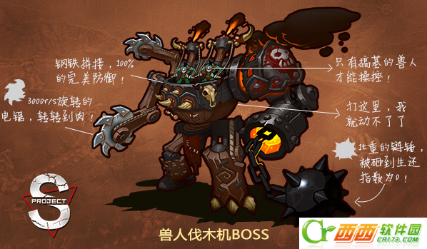 兽人伐木机是《兽人计划》里颇具特色的一个BOSS,区别于其他巨型BOSS,兽人伐木机是兽工全智能的巨大伐木机器人,左手链锤,右手电锯,被打到不是残废就是肉饼。