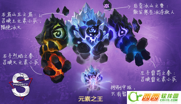 由冰、火、雷、土等元素组合的元素之王拥有至高无上的元素操控能力,相克的元素在元素之王手中变得异常和谐,他可轻松驱使各元素小兵为他战斗,还能释放雷电、火焰、冰冻等技能。不过好在巨大的元素之王脑子是由土元素构成的,智商很令人捉急。
