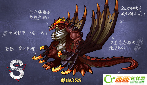 《兽人计划》中的龙BOSS常年盘踞在全金币打造的宫殿之中,异常讨厌打扰他清修的入侵者,龙BOSS煽起他巨大的翅膀可带来飓风一般的摧毁效果,同时还能喷吐熊熊烈焰,其巨大的身型让挑战者不寒而栗,但是还是有很多人冒险潜入,只为了巨龙副本中那无尽的财富……