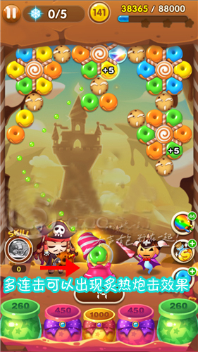 2.关卡开始是由6组风车阵型的泡泡组成,第一层的3个风车中基本都是2个同色在甜甜圈在一起,我们直接消去即可,同时还可以存一下连击,等待炙热炮击效果出现。