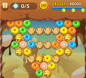 本关有大量的旋转风车,这些风车中除了普通的甜甜圈还会有曲奇饼干、死亡蜂巢等障碍物,我们在消去甜甜圈的同时要格外留意,不要击中蜂巢,蜂巢的位置会随着风车而旋转,选择一个合适的角度击中甜甜圈也很考验大家的判断和技巧。