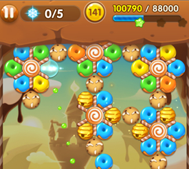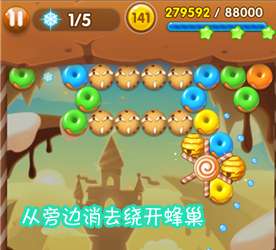这里建议大家重点击落横向炸弹下方的甜甜圈,然后通过炸弹的效果来清除掉蜂巢。
