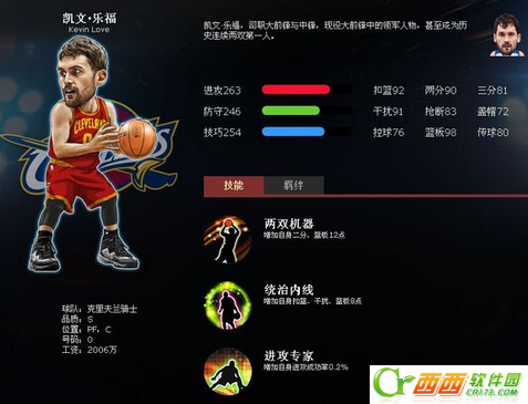 第四位出场的是 历史连续两双第一人 凯文乐福骑士新三巨头之一,本以为这个赛季骑士队将一飞冲天 谁知道半路杀出个程咬金,把乐福给废了, 拥有出色的外线投篮大基本功 让乐福在联盟中处于相当吃香的球员, 在游戏里依旧延续着他那良好的手感,但是由于这款游戏未开发出双塔战术 让此球员发挥不出多大效果,如果喜欢的玩家可以拿来收藏,楼主也在进一步开发目前版本以内线球员为主的球员颠覆以前所谓的后为时代!