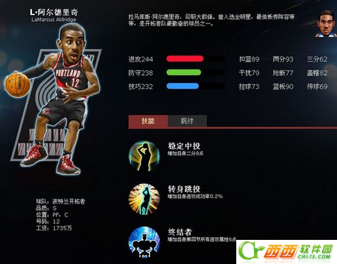 第五位出场的是 全名大前锋 阿尔德里奇2014-2015赛季阿尔德里奇 凭过得不开心,球队的主要球员老化以及板凳席的深度问题,让阿尔德里奇有些失望, 有可能下赛季会试水球员市场寻找一个有冠军实力的球队,在手游里面也是一个主攻击的球员,基本性能与乐福差不多,是一位第四节杀手,如果有以内线为主的玩家可以拥有这款球员。