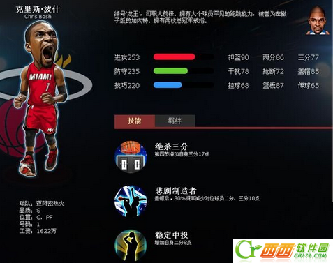 第六位出场的是 左撇子龙王 克里斯、波什巅峰时期的龙王是一位运动能力极强的球员, 擅长低位单打以及走位空切加上自身的弹跳能力在那个时候也是一位响当当的人物, 到了热火队练就了一手三分绝技 让波什的职业生涯变得更加长久,在游戏里面属性 和 作用与 楼上球星一样 在此不再过多点评。