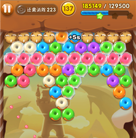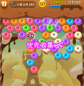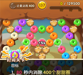 3.在争分夺秒时间关卡中,最缺少的就是时间了,所以当有+5s的甜甜圈出现时,一定要优先消去,尤其在后期,时间不多的情况下,可能一个+5s就能挽救局势了。