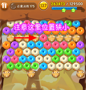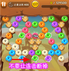 4.虽然时间紧迫,但是大家也要注意观察阵型,我们的目的是在有限的时间尽可能消去多的甜甜圈,所以不要只盯着底部的甜甜圈,多看阵型上方,是否有一次可以令较多甜甜圈掉落组合,