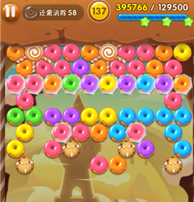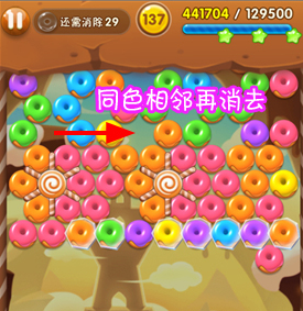 2.关卡开始的阵型就显得比较松散,颜色也比较杂,我们可以尽快将这部分的清理掉。同时要注意,尽量优先消去2个以上颜色的甜甜圈,不要让连击断掉。